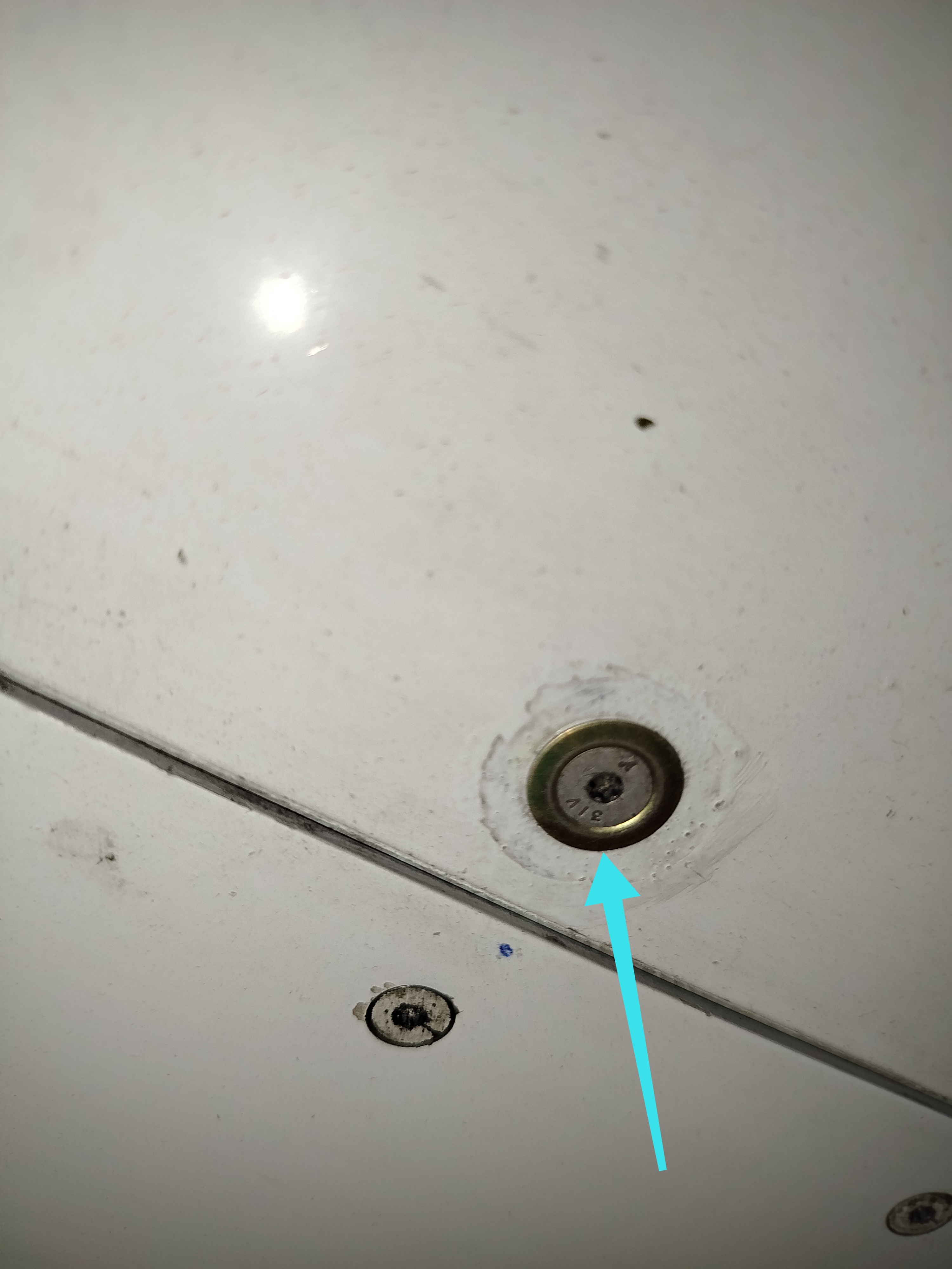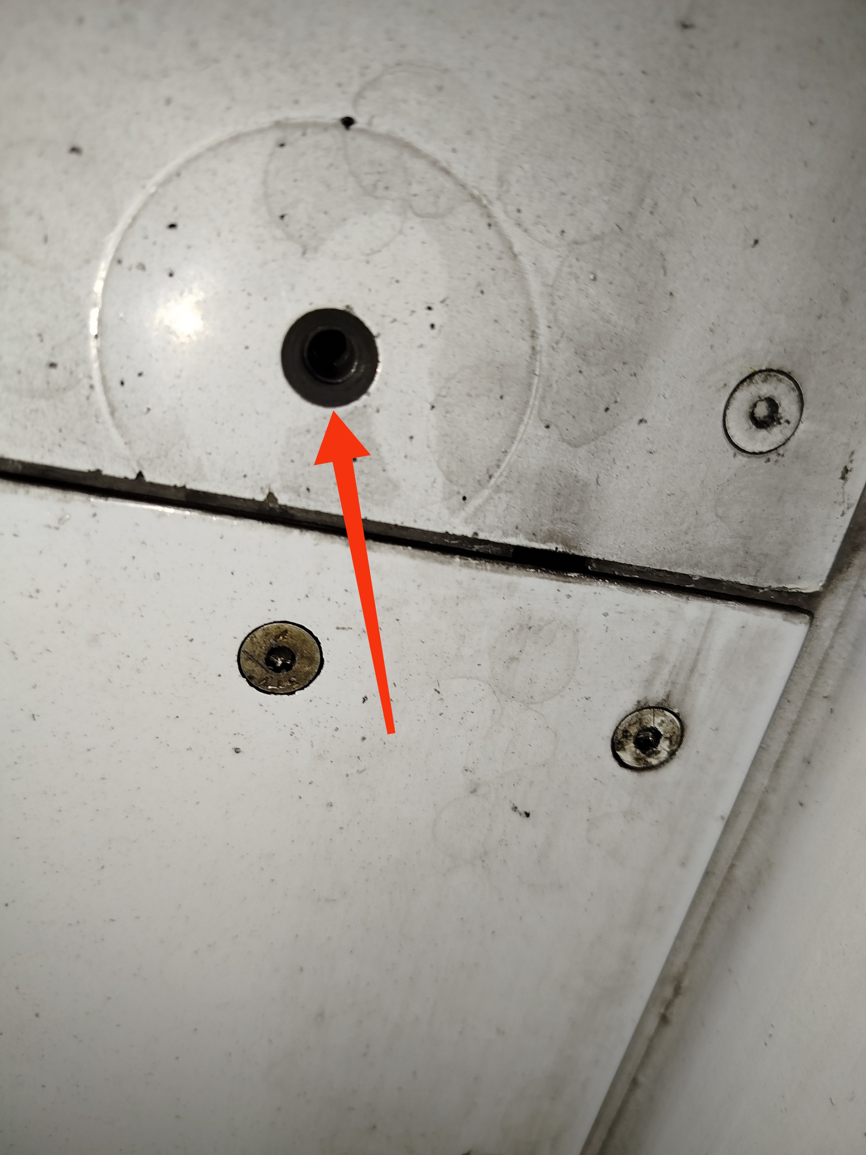 A counter-sunk screw hole section on an airplane panel showing an exposed section with an applied anti-static paste