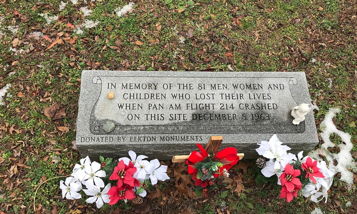 A memorial stone to remember victims of flight 214 crash (left) and an Image of a Boeing 707 (right)